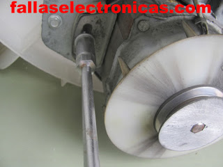 Retirado la polea procedemos a retirar el sistema de enganche, este sistema es el encargado de enganchar para que la lavadora entre en centrifugado, este sistema sólo está sostenido por dos pernos, que debemos retirar para que no sufra daños al momento de retirar la caja de trasmisión o cárter.