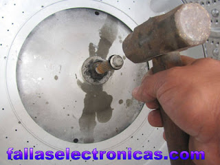 Una vez retiradas todas las piezas que podrían obstaculizar el desmontaje, aplicamos ligeros golpes en el eje para liberar la caja de transmisión. Este procedimiento es común cuando una lavadora Mabe no centrifuga y se requiere cambiar la caja.